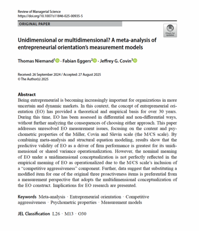 Prof. Dr. Thomas Niemand von der Abteilung Management der digitalen Transformation des Instituts für Wirtschaftswissenschaft hat zusammen mit Kollegen aus den Vereinigten Staaten, Prof. Dr. Fabian Eggers (Menlo College) und Prof. Dr. Jeffrey G. Covin (Universität Wyoming) eine Meta-Analyse zur Entrepreneurial Orientation im Review of Managerial Science (VHB-2024: B, Journal Impact Factor: 9,6) veröffentlicht. In ihrem Beitrag analysieren die Autoren 41 Stichproben von insgesamt über 12.000 Unternehmen, um herauszufinden, wie die unternehmerische Denkweise, sich innovativ, proaktiv und risikobereit zu verhalten (Entrepreneurial Orientation) – eine der wichtigsten Forschungsgegenstände der Managementforschung in den letzten 25 Jahren – am besten ermittelt werden kann. Durch die Erkenntnisse dieser Meta-Analyse können Managementforscher nun noch genauer ermitteln, welche Auswirkungen Entrepreneurial Orientation für Unternehmen hat und wie sie weiter gesteigert werden kann, um dynamischere und resilientere Unternehmen zu gestalten. Der Beitrag ist Open Access und kann unter https://link.springer.com/article/10.1007/s11846-025-00935-5 gelesen und heruntergeladen werden.